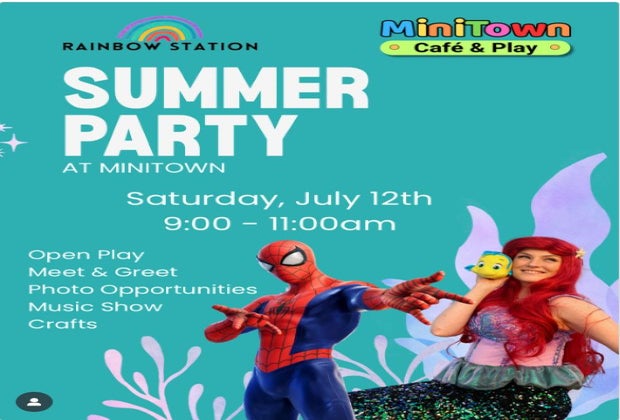 Kick off Summer with a party at Minitown! Children will be able to play, meet Ariel the Mermaid, Spiderman, make crafts and more.