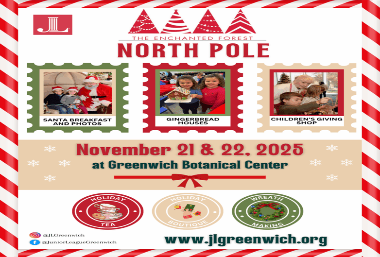 The Junior League of Greenwich presents The Enchanted Forest: North Pole Edition at Greenwich Botanical Center, Nov. 21-22. The weekend kicks off with a festive cocktail party on Friday, followed by a day of family fun! Enjoy photos with Santa, gingerbread house decorating, and shopping at our Holiday Boutique and Children’s Giving Shop. We’ll have activities everyone knows and loves, as well as a few new additions.