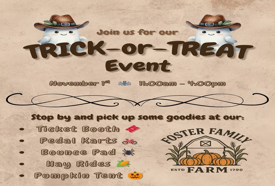 Families are invited to come dressed in their costumes and trick-or-treat around the farm. Our courtyard will be decorated in festive fall style, and little ghosts and goblins can stop at candy stations while enjoying all of our farm activities.