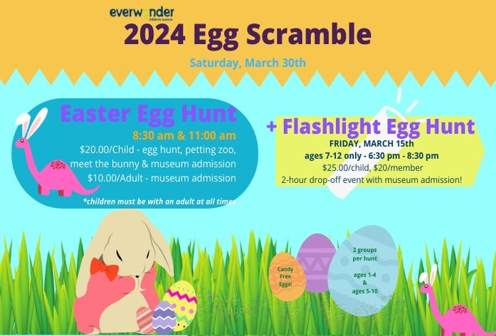 EverWonder's egg-citing and fabulous Annual Egg Scramble will take place Saturday, March 30th, 2024. With a choice of egg hunt times and hunts separated by age groups, it is an egg hunt tailor-made for you. Kids can meet a bunny up close and see the petting zoo too.