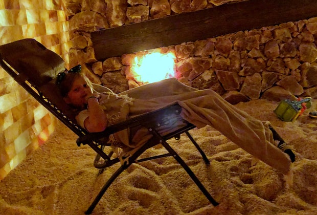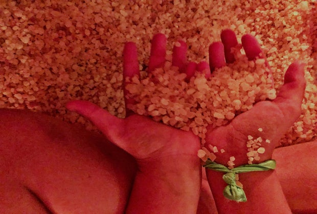 We walked to to a small “cave like” room that was created with 100% authentic Himalayan Pink Salt. The 84 minerals and nutrients it contains makes it the purest salt for inhalation. The walls were created with tons of large salt crystals that glow a beautiful shade of pink. The floor was covered with about 6 inches of beautiful pink salt crystals that were begging to be touched and played with, and when we looked up there was a beautiful “starry sky” created with lights. A soothing salt brine cascade adorns the back wall of the cave.