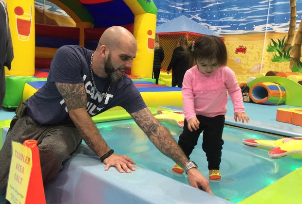 Ed Thorness and daughter Olivia chase faux fish in the sensory "water bed" at Jump Off! in Stratford.