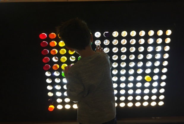 As soon as we pulled into the museum parking lot, my six-year-old son spied the statues of Velociraptors out front and exclaimed, "this is my kind of place!" The parking lot was plowed and the walkways were clear despite a heavy snowfall just a day before our arrival. We snagged our tickets, hung up our coats in the main lobby, and headed into the first exhibit all about color and light. We learned about Newtonian Color Wheels, 3-D, and ultraviolet light. We struck poses and stood perfectly still in a little corner of the exhibit where a bright light captured our shadows on a special wall. There were lots of kiddos of different ages running around and each seemed to see something different in the exhibits.