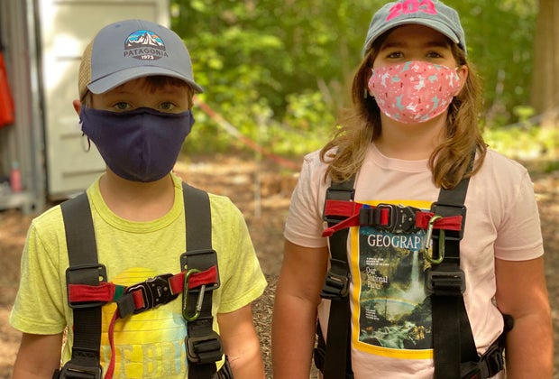 Adventure Park at the Discovery Center in Bridgeport makes sure kids are outfitted securely in 2020—with safety-checked harnesses and masks! Photo courtesy of Ally Noel
