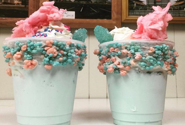 Two friends enjoy a Brownie Shake with unicorn and ring pops and candy add-on at Cream & Sugar. Photo courtesy of Cream & Sugar.