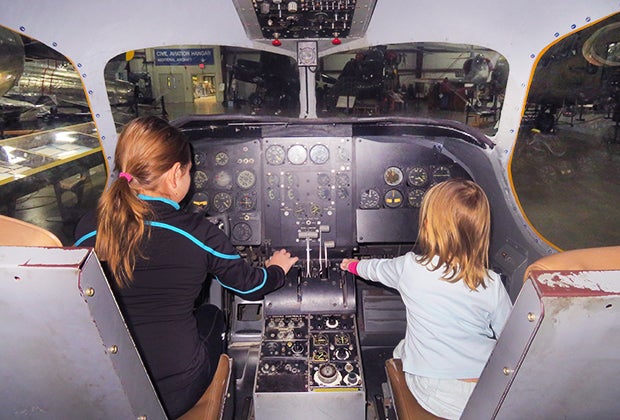 Kids can get into the planes during Open Cockpit events. Photo courtesy of the New England Air Museum