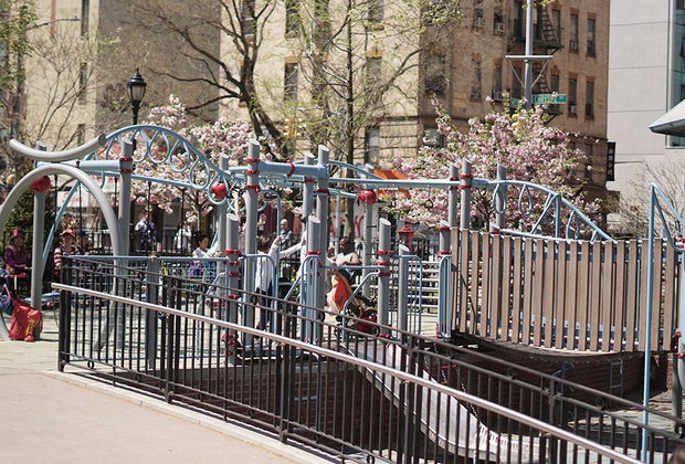 Thanks to a fairly recent renovation (the city spent $5 million to make over the play area in summer 2011) creature comforts abound, whether you're there to play or supervise—including restrooms. There are eight round picnic tables near the entrance, often filled with local seniors playing games. The landscaped perimeter of the park lends plenty of color on a spring afternoon and provides a bit of shade when the temperatures soar.