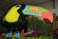 I was particularly impressed by the Garden of Bahia, which was inspired by the colonial neighborhood of the same name. Its centerpiece is an eight-foot tall toucan sculpture covered with dried native button flowers and black magnolia standing in a nest of tropical flowers and greenery. Another highlight is the Amazon Garden which dominates much of the landscape in the show. You enter by walking over a wooden bridge and find a beautiful waterfall, and chocolate, coffee, papaya and citrus plants, all indigenous to Brazil's rainforest.