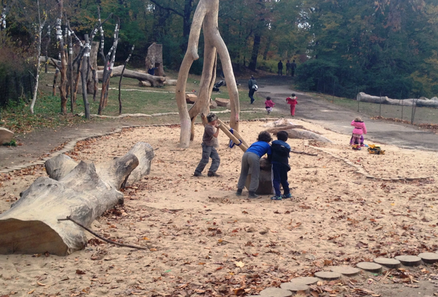 There is plenty of space for kids to run free and climb wildly, plus a water pump and a sand area. Scattered, painted tree branches encourage imaginative play and various tree trunks and stumps offer tons of variety. Parents will appreciate the beautiful wooden paths and wood-carved seating areas.