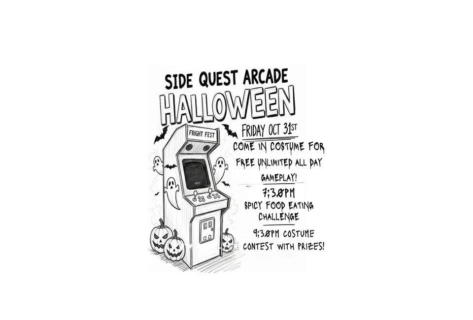 Side Quest Arcades presents the ultimate annual Halloween party, "Fright Fest at the Arcade," happening on Friday, October 31st. Bring your friends and your best costume for a thrilling night of games, challenges, and prizes!