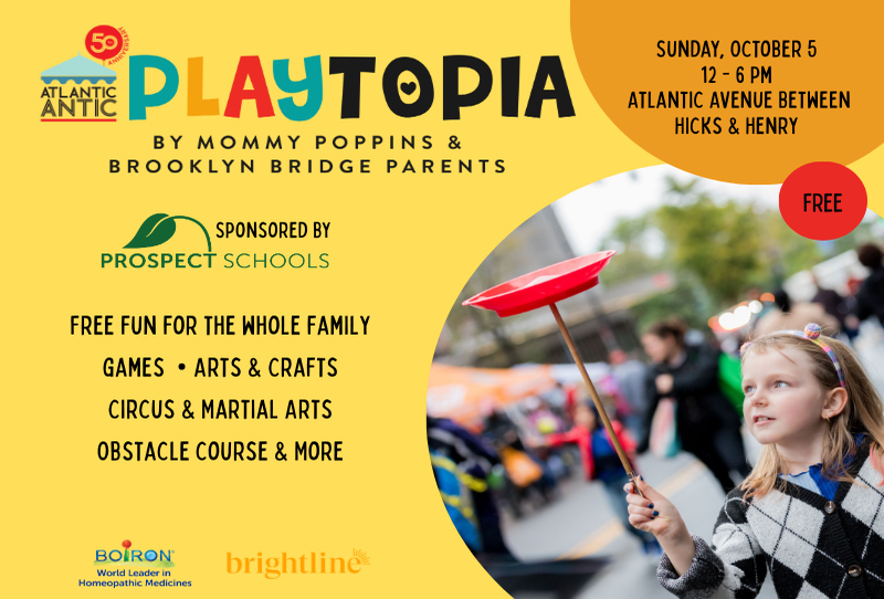 NYC's largest street fest, the Atlantic Antic, fills Brooklyn’s Atlantic Avenue with food and craft vendors, family fun, and amazing performances. A highlight for families is Mommy Poppins and Brooklyn Bridge Parents' Playtopia at Atlantic Antic, powered by Prospect Schools. This block-long family fun zone is stuffed to the brim with STEM activities, balloon twisting, freebies, arts and crafts, interactive games, circus activities, and more for kids of all ages.