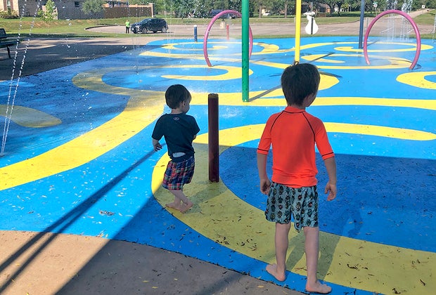 Enjoying the huge splash pad at Centennial Park. Photo by the author.