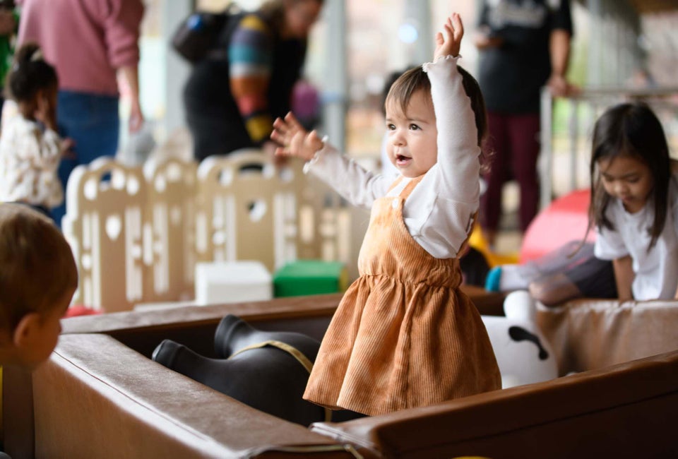 Toddlers and their caretakers enjoy a morning of interactive story time, costumed character meet and greets, activities, and soft play equipment from Toddler Towns.