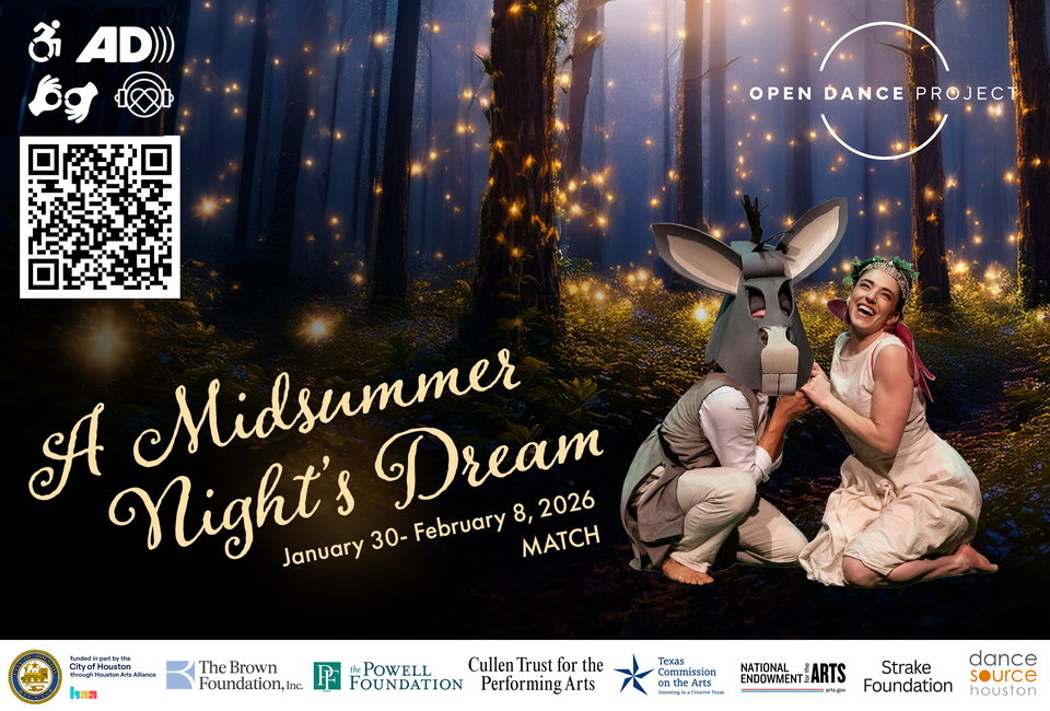 Based on Shakespeare’s beloved comedy, with a whimsical score by Two Star Symphony’s Kirk Suddreath and John Duboise, spoken text and narration, puppets by Afsaneh Aayani, and guest performances by Open Dance Project's pre-professional youth ensemble, ODP2, A Midsummer Night’s Dream offers accessible entry points for young audiences and their families to experience the magic of dance theater and celebrate creativity and imagination!
