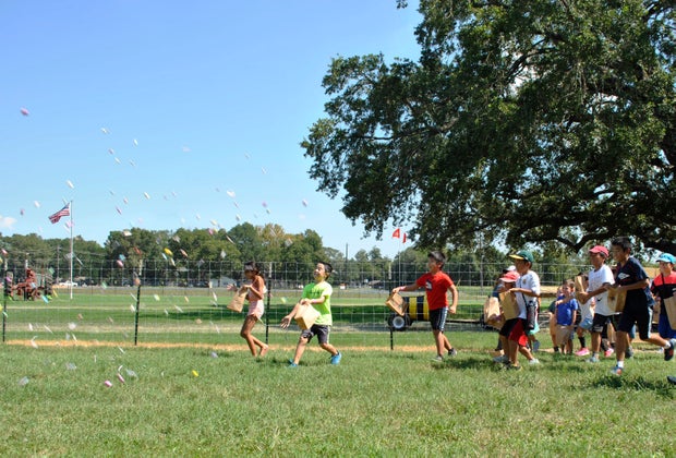 A "candy cannon" launches candy into a field for kids to gather.