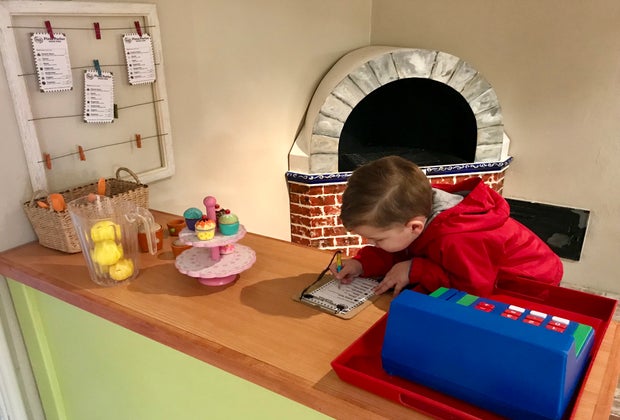 Designed for kids ages 2-10, each room of the museum boasts different activities that inspire curiosity and creativity. On our most recent visit, our three-year-old basically had the run of the place and was able to thoroughly enjoy exploring each room of the museum at his own pace. We started out in the very front room of the museum where our son got to pretend to be a fisherman on a small wooden boat complete with kid-sized fishing poles, nets, life jackets, rain coats, and foam fish to “catch” with the hooks of the end of each pole. In the same room, there is also a play kitchen set up with a pizza-making station, brick “oven,” a cash register, and a restaurant booth, table, and chairs for parents to sit at while their kids serve up a delicious (plastic) pizza lunch. At the opposite end of the room, a kid-sized lifeguard tower offers kids the chance to climb up and keep watch.