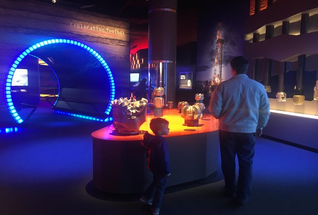 While they were busy traveling around oil country in Texas, my daughter and I wandered over to check out "Energy City," a 3-D model of Houston. It's hard to really involve a 1-year-old in a museum experience, but she was entranced with Energy City. The 3-D model is made from projections that transform the miniature city from a mass of white buildings and terrain to one that is alive with different colors of energy chains. We were both immersed in watching the cityscape change over and over again. While we waited, I also took a test to see which energy-related jobs I was qualified for (interestingly, my love for the outdoors landed me on jobs like a roughneck several times), and once they were back we played and gawked at the different equipment and displays for much longer than I thought would hold a toddler boy's attention.