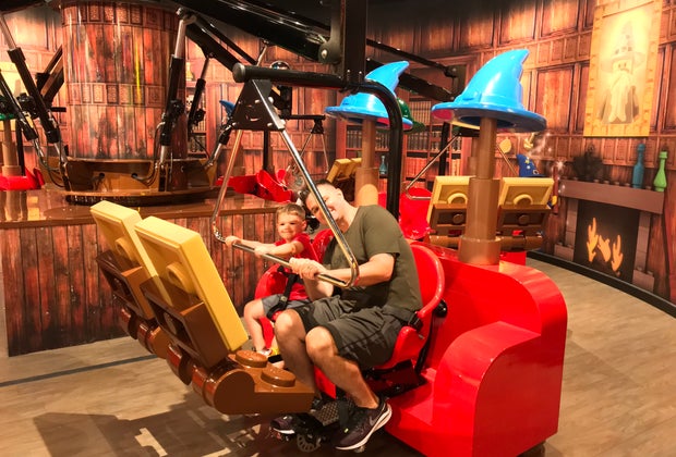 Our favorite ride in LEGOLAND Discovery Center was Merlin’s Apprentice. This carnival-type ride takes riders taller than 3’ on a magical journey up, down, and around, flying through the air while pedaling an enchanted cart. The faster you pedal, the higher your cart goes. We rode it several times giggling and laughing the entire time, and there was never a line. We just hopped off, walked around to the entrance, and hopped right back on.