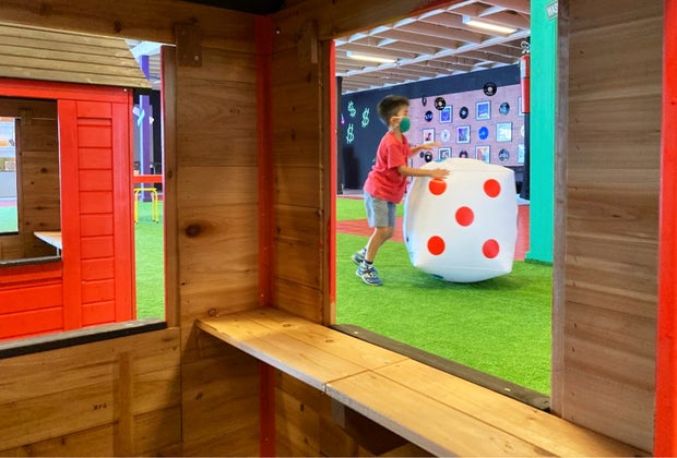 There is a small play area for younger kids in the center of the room. Children can duck in and out of the small wooden playhouses, sit at the little table and color with crayons, or crawl through a caterpillar-shaped tunnel. My kids thought it was fun to roll a couple of giant inflatable dice with their dad in the open space.