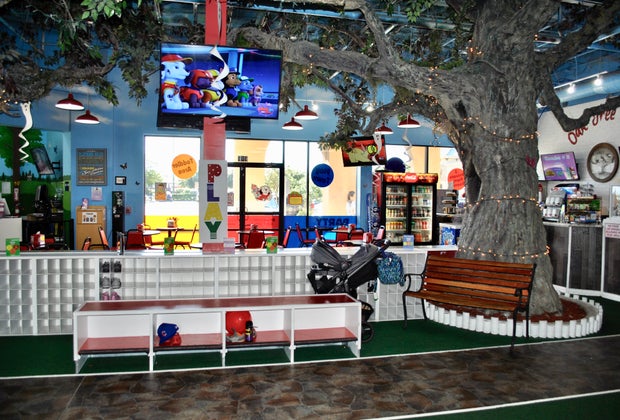 Although no outside food or drink is allowed, a well-stocked snack cafe offers plenty of delicious options when kids get hungry or thirsty. Ample seating and an open floor plan also allow parents to sit in the cafe area and still easily see their kids playing on both the play structure and in the kid city. The only area not easily seen from the cafe is the small section reserved for ages two and under at the back of the venue. Also at the back of the venue, several arcade games are available for play for a small fee (quarters are required).