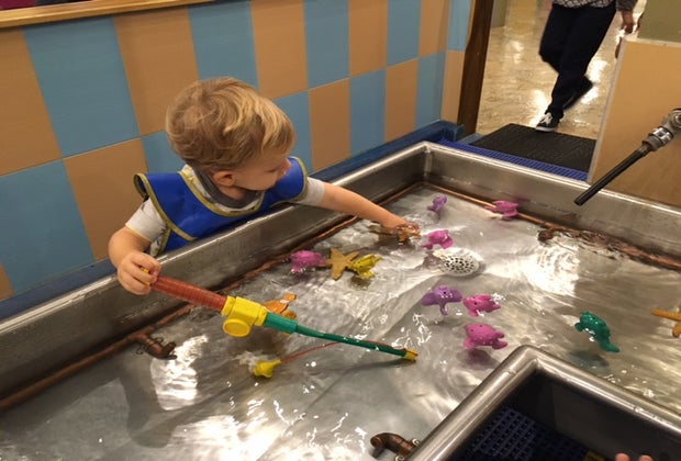 The other half of the museum includes an area of over-sized blocks for building and activities, half of a truck sticking out of the wall where kids can pretend to drive, and an area of private party rooms. There is also an enclosed water sensory area complete with plastic aprons (hallelujah) and fishing poles. It kept my toddler focused for nearly 15 minutes as he tried to fish out the colorful fish in the trough. There are other smaller activity areas, including a train table, sensory bins, and a toddler zone for smaller babies to crawl around without fear of being trampled.