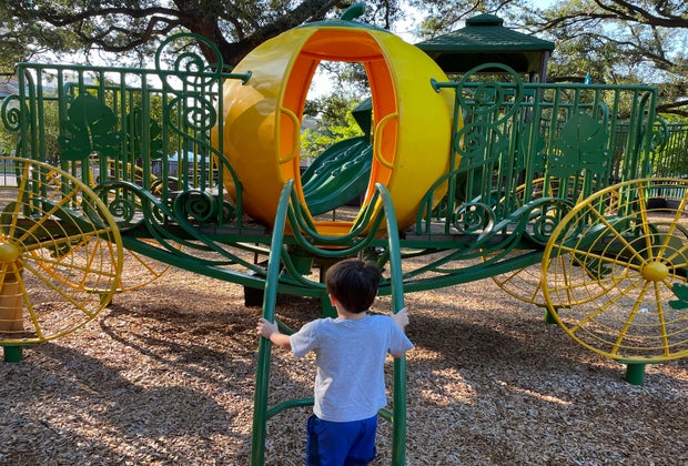 The playground at River Oaks Park has a unique Cinderella-style pumpkin coach. Photo by Jessica Stautberg