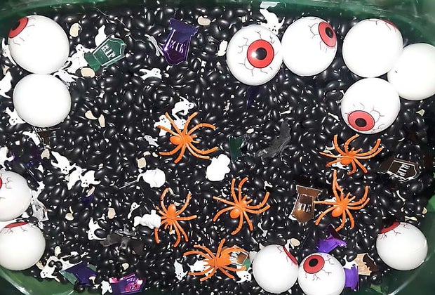 Make a spooky Halloween sensory bin with black beans that kids can scoop and measure. Photo by Sandy Fredricks