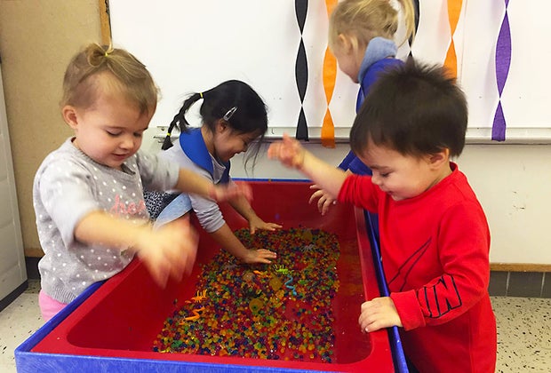 Dried items are different from wet in that they can create a satisfying sound and they’re generally easier to clean up. Beans come in a variety of colors, so you can use black beans for a space or Halloween theme, red beans for fall, and white beans for winter or Valentine’s Day. Pasta can be dyed to match various themes as well. Parents can mix in dollar-store toys like plastic spiders, heart or star beads, or fake leaves to match various themes.