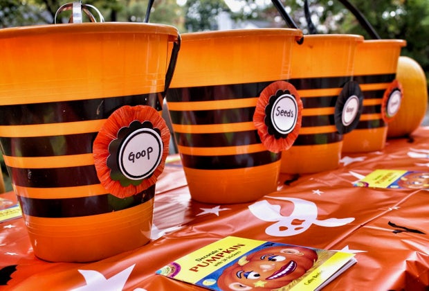 Pumpkin patch stomp is exploding with fun. Fill orange balloons with candy, small toys, or other Halloween trinkets before blowing them up, then set them up on the lawn and get stomping.