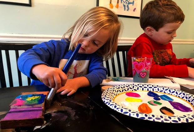 29. Grab an old cardboard box or scrap wood that's been sanded down and set out washable paints and paintbrushes. Decorate!