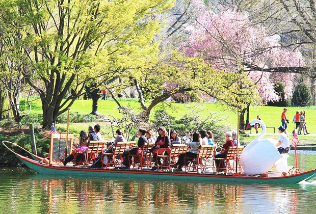Spring brings the budding trees and the swan boats! Photo by Ingfbruno via Wikimedia Commons/CC BY-SA 3.0