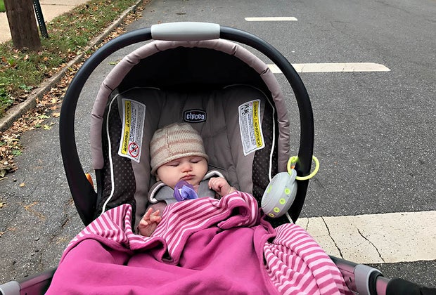 Clip this portable sound machine onto the baby's stroller or car seat to help baby sleep on the go. It's also small enough to pack in the diaper bag or suitcase when traveling or trying to catch a nap somewhere other than home. Charges by USB.