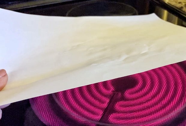 Once dry, an adult should hold the sheet of paper over a heat source. We used an electric stovetop. You can also use a lamplight or blow-dryer.