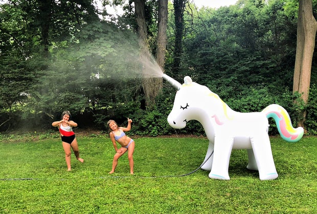 Just try not to laugh while playing under the giant unicorn sprinkler. Photo by Ally Noel