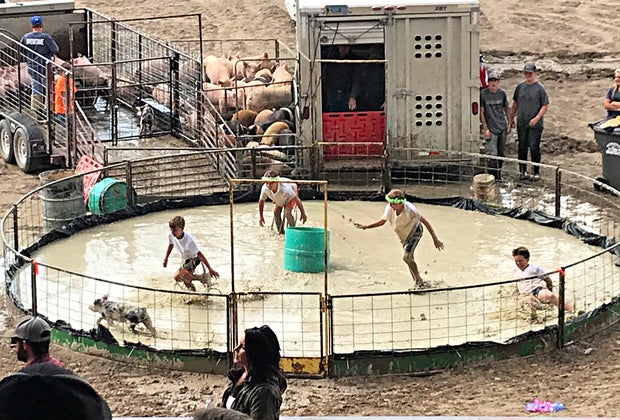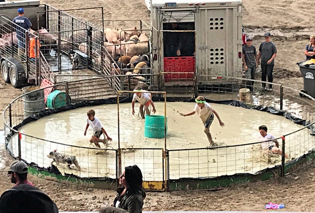 6. Cheer on kids wrestling piglets at the rodeo. Though it sounds more than a little strange, the kids' pig wrestling competition is a beloved—and hilarious—summertime tradition at the Teton County Fair, which happens every July in Jackson. Teams of local kids dress up in inspired costumes and work together to see how fast they can deposit little squealers into a bucket placed in the middle of a muddy pen.