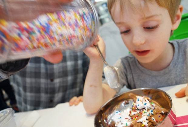 The highlight is doing it yourself, and kids as young as 3 can manage the process. But, sometimes, you just want to take it easy. For those days, CoolMess offers a traditional ice cream shop, complete with sundaes, milkshakes, scoops stuffed into flavored waffles cones from The Konery plus Fat Witch Brownies, donuts from Dough, coffee (thank you!) and a wall of candy. If you are worried about ruining your youngster's dinner, you can order anything from Burger Heaven and have it delivered to your table at CoolMess. Any leftover ice cream can be packed to go.