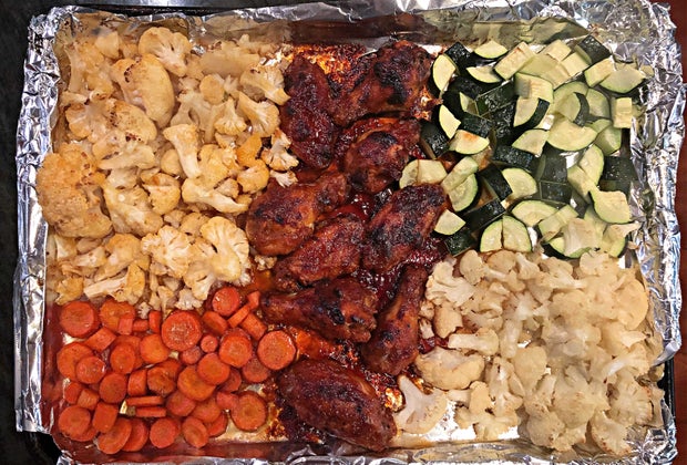 This meal originated this way: My son asked for wings for dinner. I don’t like them, but it made me crave buffalo cauliflower. My husband won’t eat anything spicy, so he requested plain cauliflower. My kids don’t like cauliflower, so my daughter asked for honey glazed carrots. My son only eats raw carrots, so he asked for zucchini. I said if I could cook it all on one sheet, everyone could have what they wanted—and it worked! You can use your favorite veggies in the four corners to customize this into several sheet pan dinners (and can even use chicken breast in place of the wings).