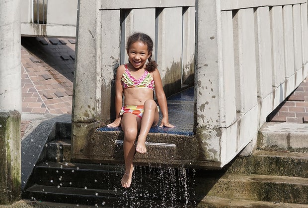 The playground's current design was constructed in 1972 and named as an ode to the Egyptian Wing being built across the 86th Street transverse at the neighboring Met. The focal point here is definitely the large, interconnected, ancient-like pyramids. On hot summer days, the Nile is reincarnated here: Water bubbles from an obelisk-like structure on the pyramids and trickles down and along the concrete paths. As kids happily soak their feet, they're led to the big water play area, where tall sprinklers jet from various angles, soaking everyone and pooling at their feet.