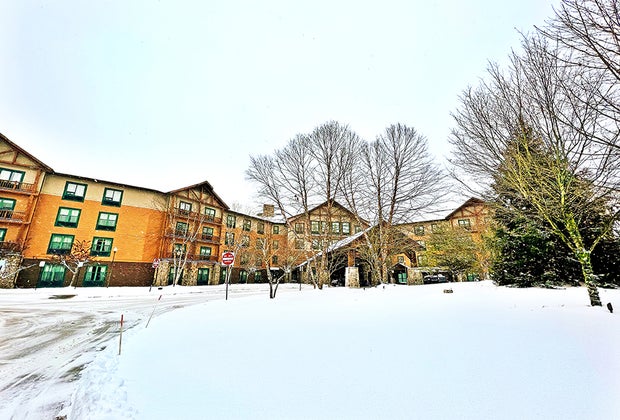Six Flags Great Escape Lodge is located directly across the street from Six Flags Great Escape and just 10 minutes from nearby Lake George. When you arrive, you’ll find plenty of complimentary parking. From the outside, the size of the resort is overwhelming, but the expansive hotel has an intimate, cozy feel as soon as you walk inside. The lobby boasts high ceilings with wood beams and a comfortable lounge area with a fireplace. There are also complimentary luggage carts for guests to use located just inside the front doors on the right.