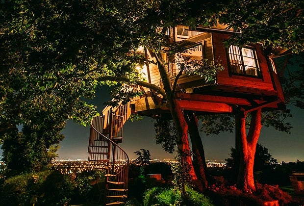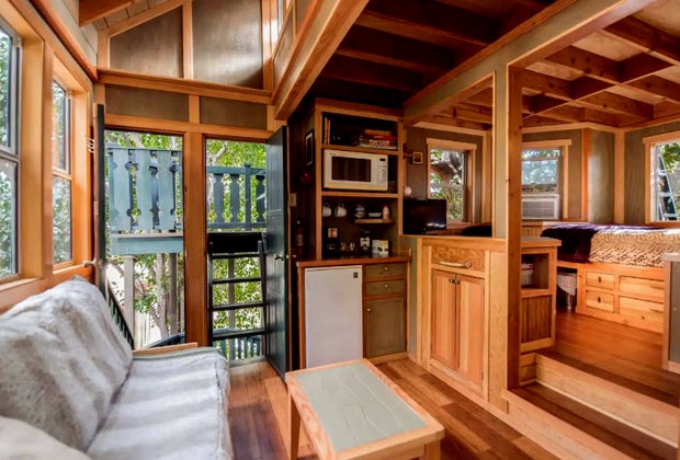 You'll find this whimsical tree house nestled between three sycamore trees overlooking Silicon Valley. A spiral staircase takes you 14 feet up, where you'll find magical features, including a stained-glass window and a tree growing through the house. Although the family is sleeping in the trees, you'll still have access to a full bathroom and a kitchenette with a sink, small stove, and a mini-fridge. If you don't feel like cooking, a local pizza place, Pizza Maria, delivers pizza directly to your door in the sky.