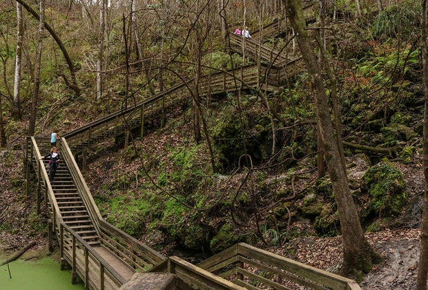 Venture into a miniature rainforest created by a sinkhole at this popular state park.