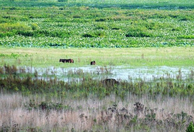 Bison and wild horses roam the prairie at this state park. Visitors will also see an abundance of alligators along the parks eight trails.