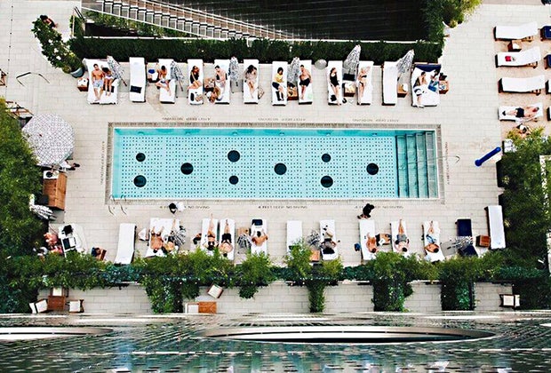 Here's another great New York City hotel pool, but this one dwells at the airport, rather than downtown. The just-opened TWA Hotel at JFK Airport easily claims one of the more unique pools on this list. Its rooftop hosts an infinity pool that treats swimmers to a view of the tarmac at the city's busiest airport. The hotel is literally connected to the airport via an elevator at Terminal 5, making the pool the perfect stop for layovers. Yes, it's open to day-trippers, including kids, but families will need to book a reservation to swim in the pool if they aren't staying the night. One visitor told us the pool can get crowded but her tween plane enthusiasts dug the location.