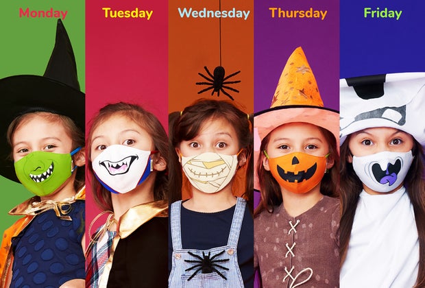 Crayola Halloween non-medical mask packs come with 5 face masks for each day of the school week.