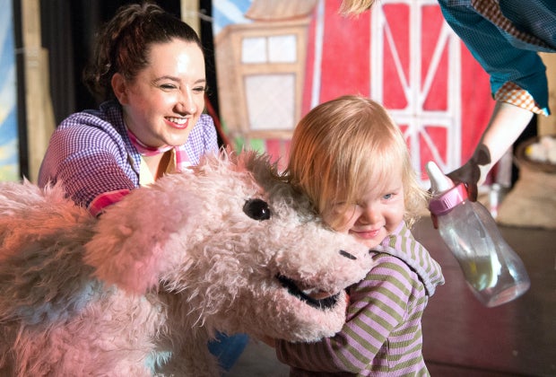 There is little dialogue, but plenty of animal noises—cheep, cheep—dancing, compelling but simple music and brief songs—“a wiggle, wiggle, a wiggle wiggle"—to keep young kids engaged. A young calf and its bell come clanging in as two actors push it across the stage with its tongue flicking back and forth, and half the kids stand to get a better look.