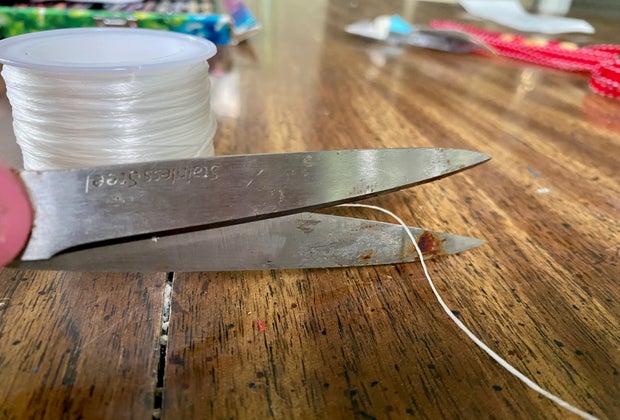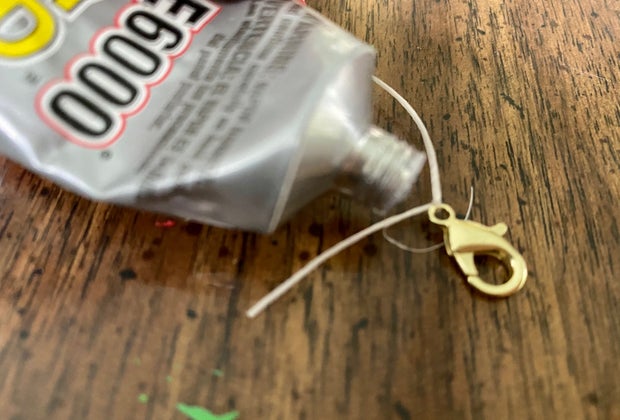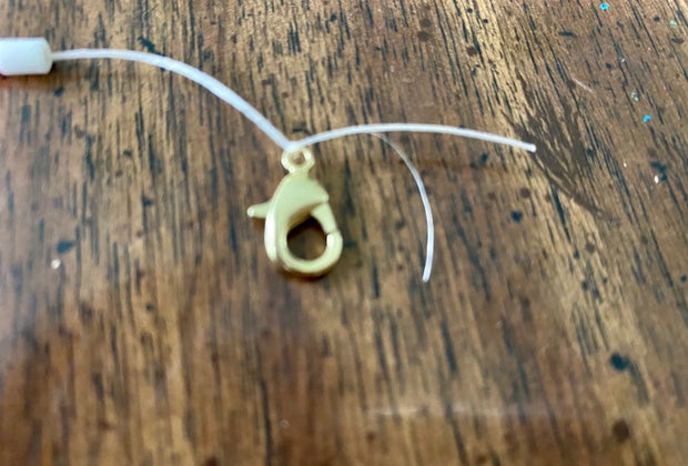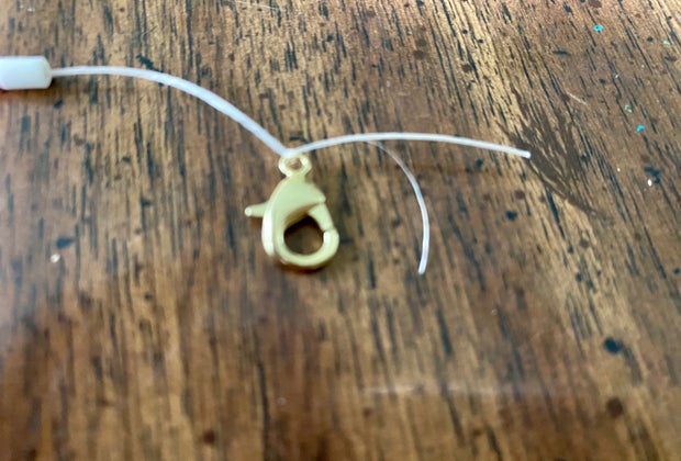 When you have finished beading, tie the other alligator clasp to the elastic cord with a knot.