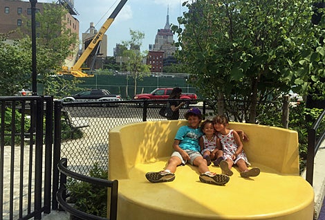 The Hudson Yards/Hell's Kitchen Alliance will help to bring entertainment and events to the public space, including a grand-opening kickoff in the coming weeks that will include kid-friendly performers, face-painting and other activities. A second-phase of construction that will extend the park up to West 39th Street will include additional kid play structures, an Alliance representative tells us.