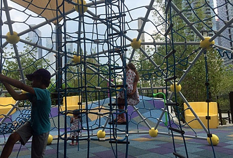 The centerpiece of the playground is a giant climbing dome that's reminiscent of those old-school metal structures parents might recall from their youth. But this is no plain-Jane jungle gym. It's jam-packed with a challenging series of ropes for climbing, lounging and generally monkeying around. The floor surface below is cushy underfoot and made into a colorful checkerboard.