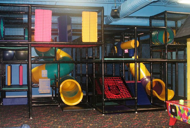 This indoor playground features a series of themed play spots, all visible from a central area where parents can lounge and supervise. There's a climbing wall, a pretend-play mini-village, and tons of tubes, tunnels, slides, and ride-on toys. An on-site concession stand serves snacks.