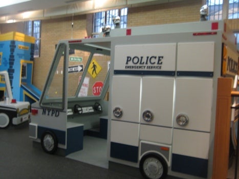The exhibit is dominated by 2 large vehicles and a police “precinct” that is really a fun climbing and sliding play structure. The vehicles are great and car loving kids will for sure spend lots of time in them. One is an almost life sized emergency unit van with displays of real life police gear – but what the kids will like most about this van is the gas pedal that sounds like a vrooming engine, sirens and lights to operate and lots of buttons to push.